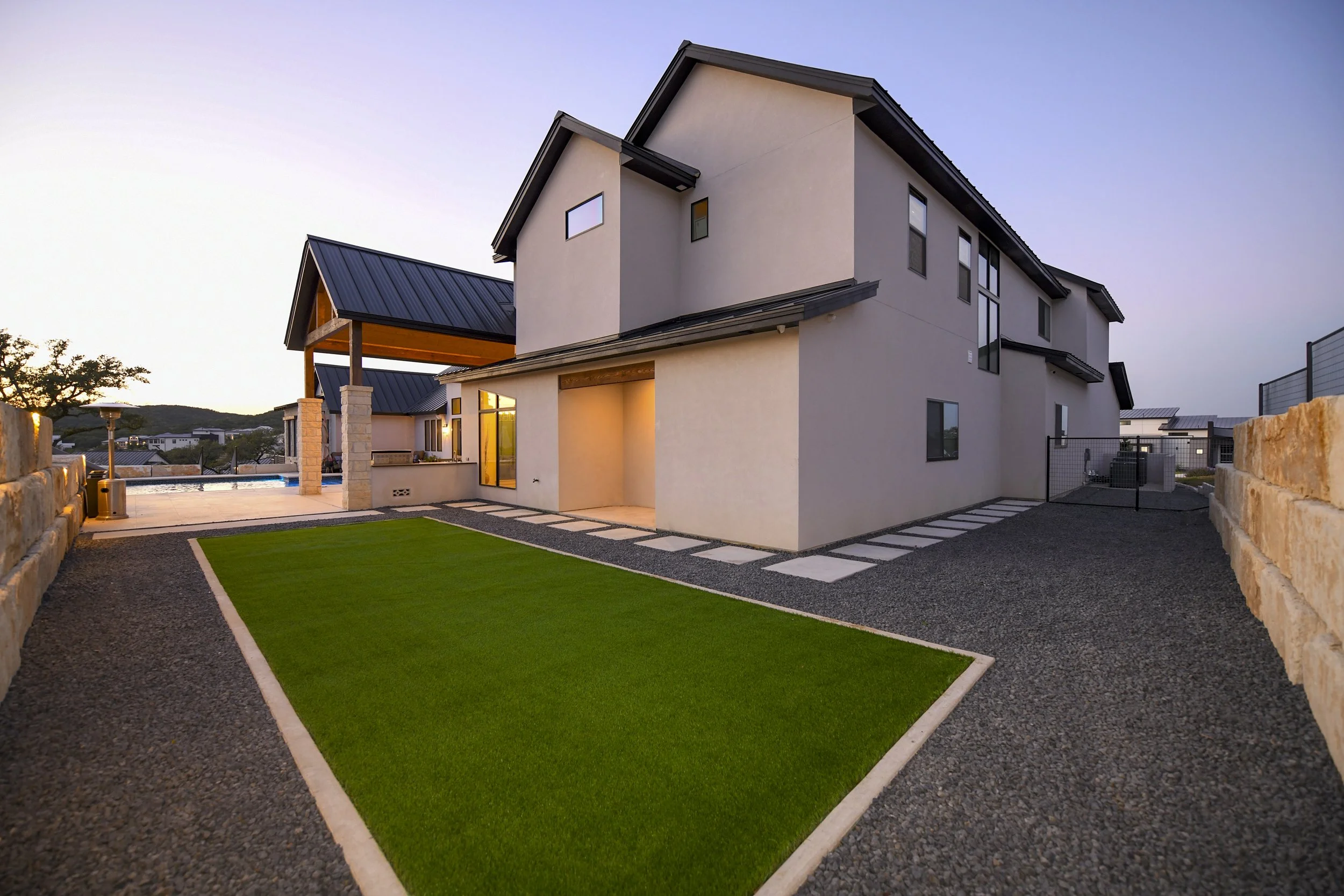 The turf areas were a blend of artificial turf for high-traffic zones and hydroseeding for cost-effective green coverage elsewhere — offering a balance of form and function. Custom welded fencing was installed for perimeter security and visual cohesion.